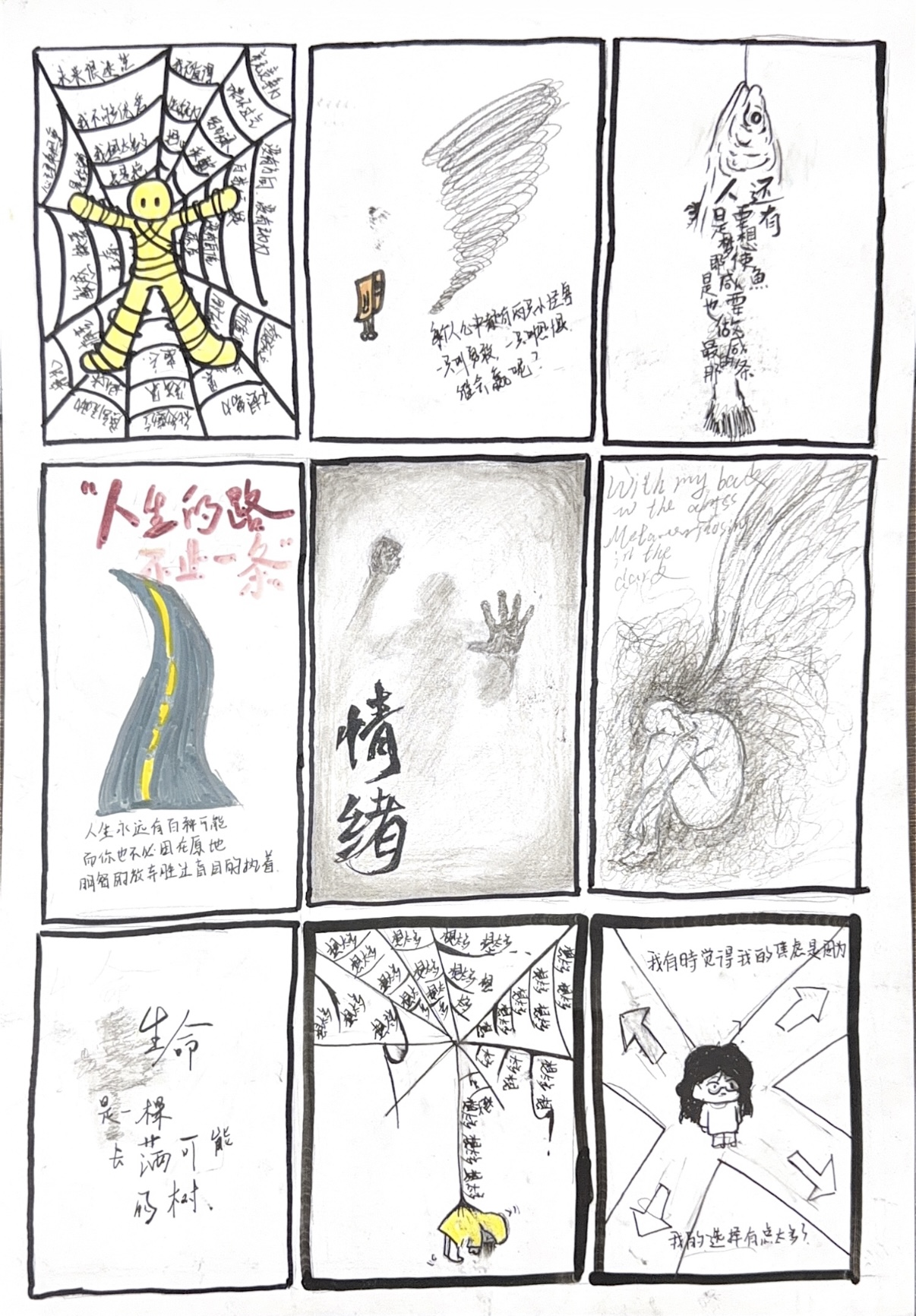 活动中,主持人阐释了活动核心理念,将人生目标拆解为九大核心维度,倡导以“画笔+文字”的可视化形式让目标具象化。同学们在九宫格画纸上投入创作,结合自身实际,用简笔画和文字呈现学业、职业、身心健康等方面的规划,每幅作品都承载着青春期许。