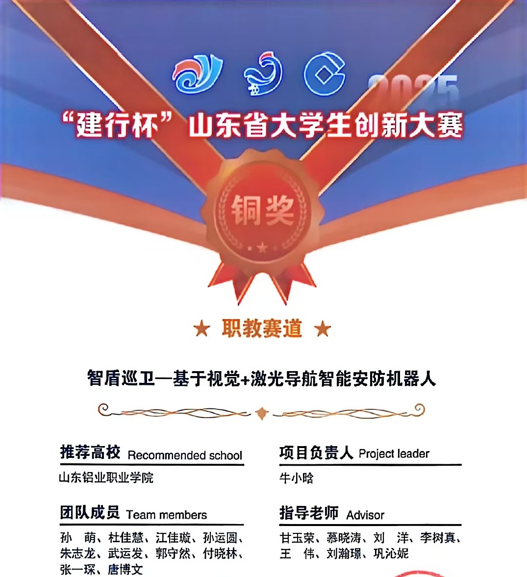 2025年11月24日,中国国际大学生创新大赛全国总决赛成绩揭晓。我校“项目”团队历经数月深耕细研,从理论学习到实践打磨,从迭代优化到突破创新,最终脱颖而出,斩获全省铜奖,用以青春之力书写新时代大学生的创新答卷。