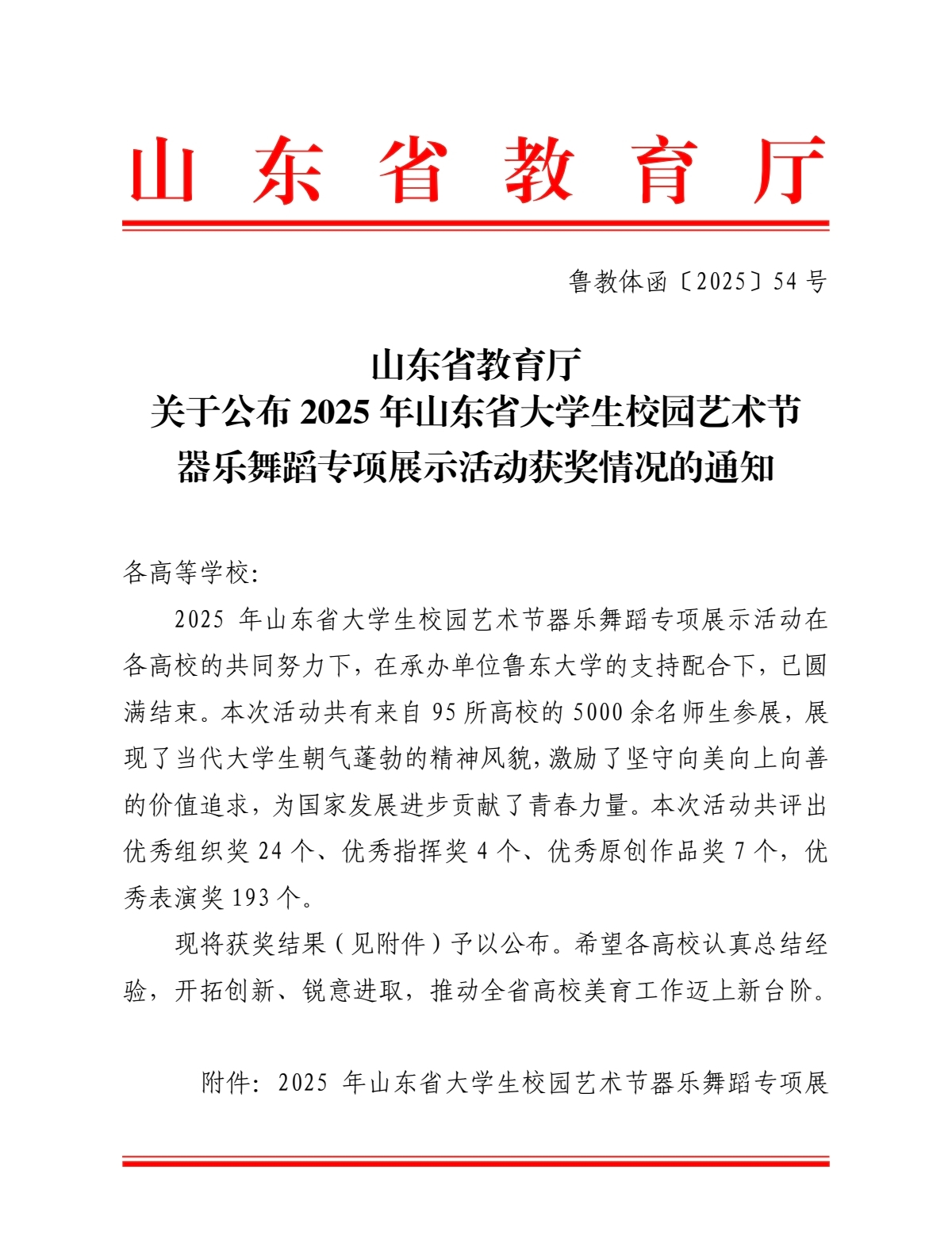 近日,山东省教育厅正式下发《关于公布2025年山东省大学生校园艺术节器乐舞蹈专项展示活动获奖情况的通知》(鲁教体函〔2025〕54号),我院凭借扎实的组织工作与高水平的艺术创作脱颖而出,斩获优秀组织奖,选送的舞蹈作品《半条被子》荣膺一等奖。