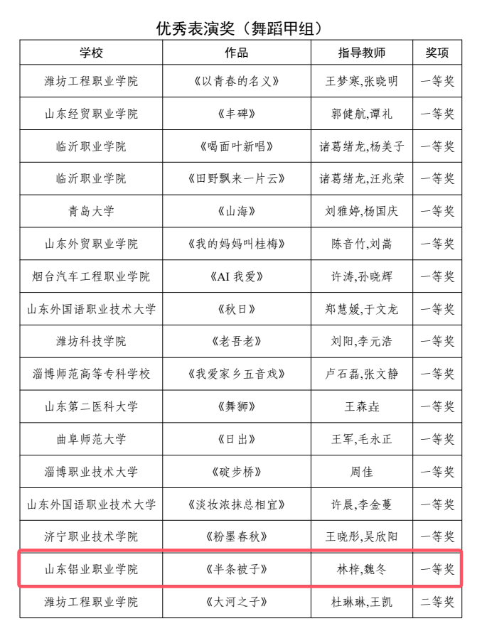 作为全省高校艺术领域的重要赛事,2025年山东省大学生校园艺术节器乐舞蹈专项展示活动汇聚了全省95所高校的优秀艺术作品,竞争尤为激烈。我院高度重视此次赛事,自活动启动以来,由学生处统筹协调,各部门密切配合,从作品选拔、编排打磨到后勤保障全程精准发力,为参赛团队提供了全方位支持。此次获奖是省教育厅对我院艺术教育组织工作规范化、专业化的高度认可,也是我院坚持“以美育人、以文化人”理念的生动实践。
