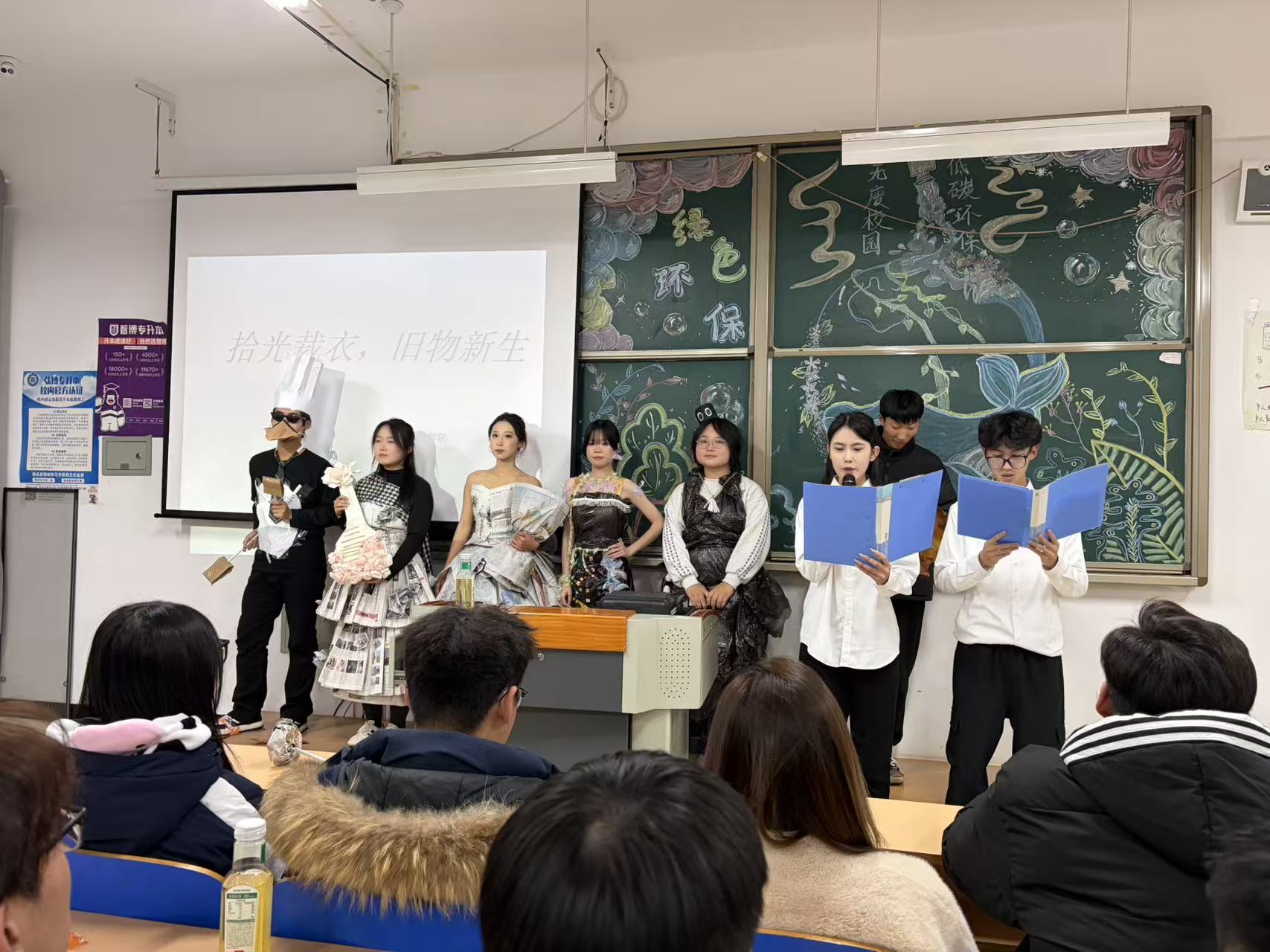 学生们通过裁剪缝纫、手工DIY、科技赋能等方式,将旧衣物改造为时尚配饰、家居用品,用旧报纸、旧纸壳变身创意手账。通过“走秀+讲解”的方式进行作品展示。